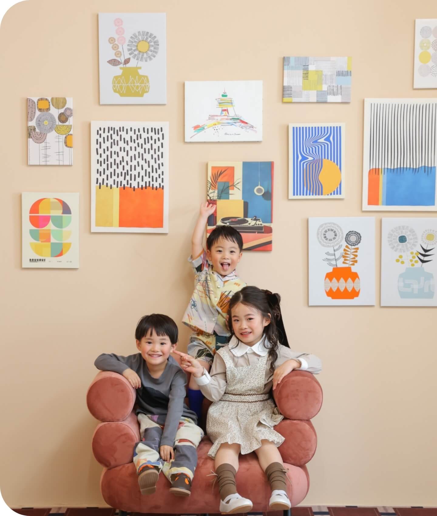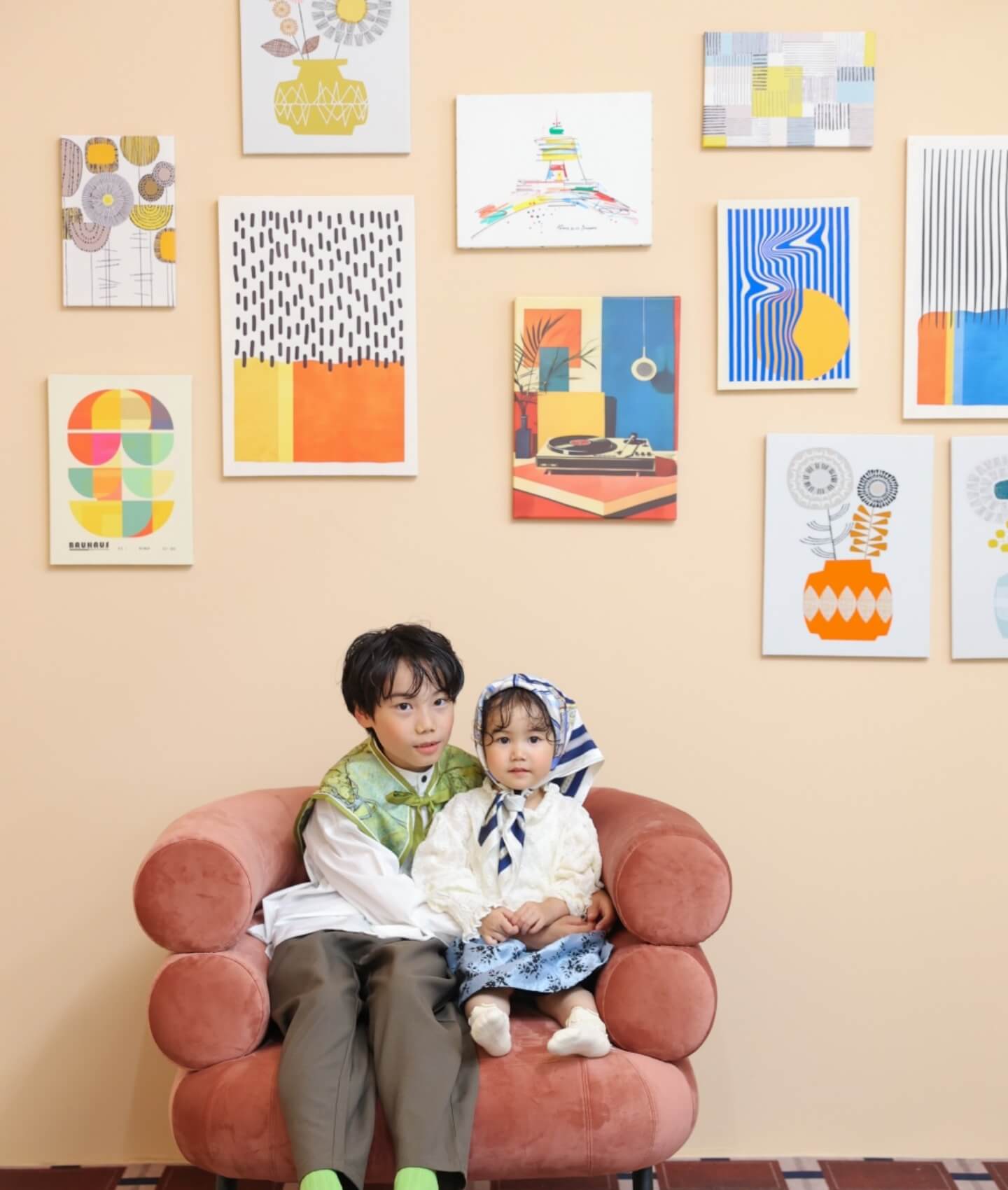 お子様の楽しそうな表情を輝かせるカラフルなアートや個性豊かなインテリアが特徴のエリア。アートを取り外して少し大人っぽくベージュの壁紙で撮影することもできます。