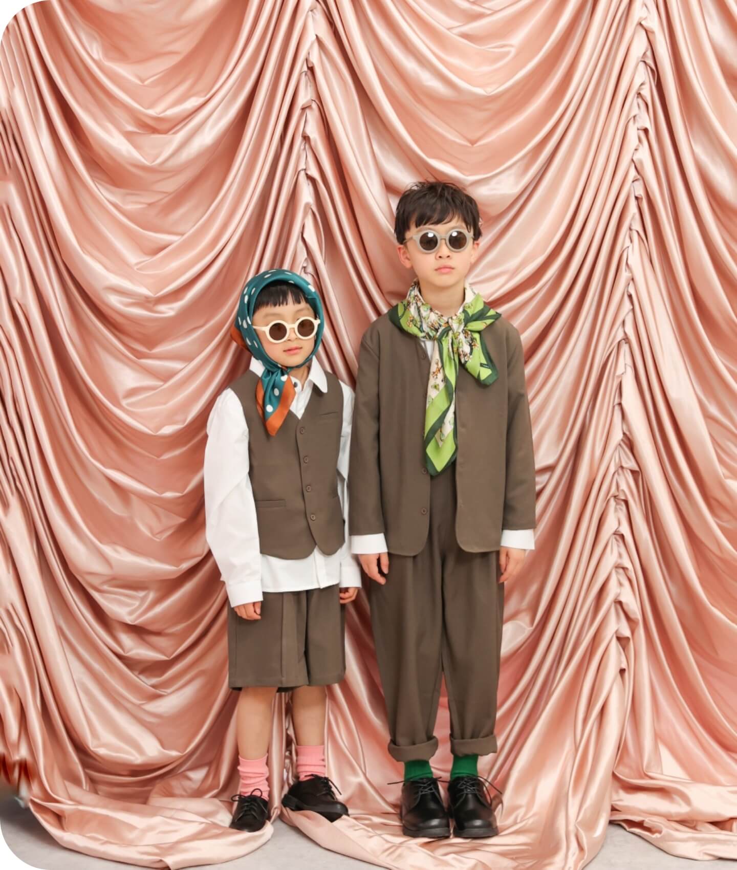 高級感のあるピンクのカーテンとシルバーのカーテン、どちらも楽しめるエリア。雰囲気を変えてグッと大人っぽい雰囲気のお写真が撮りたいときにオススメです。